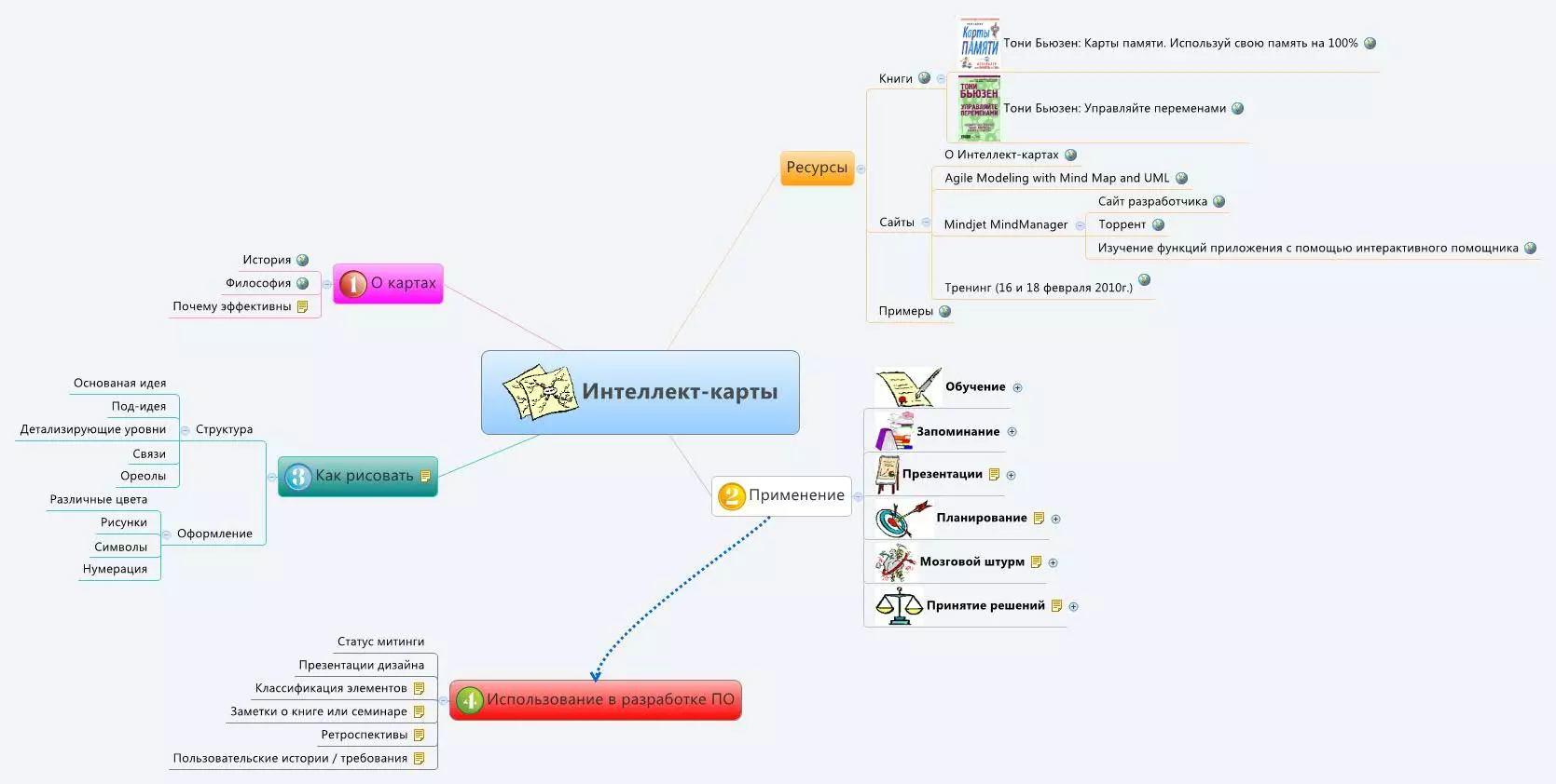 Интеллект-карты используются в работе, повседневной жизни и обучении. Они помогают тренировать организованность и навык тайм-менеджмента. Постановка основной идеи в центр и отходящих подпунктов по кругу или цепочке помогает систематизировать задачи, выделять главное и второстепенное, обозначать задания, требующие мгновенного выполнения.