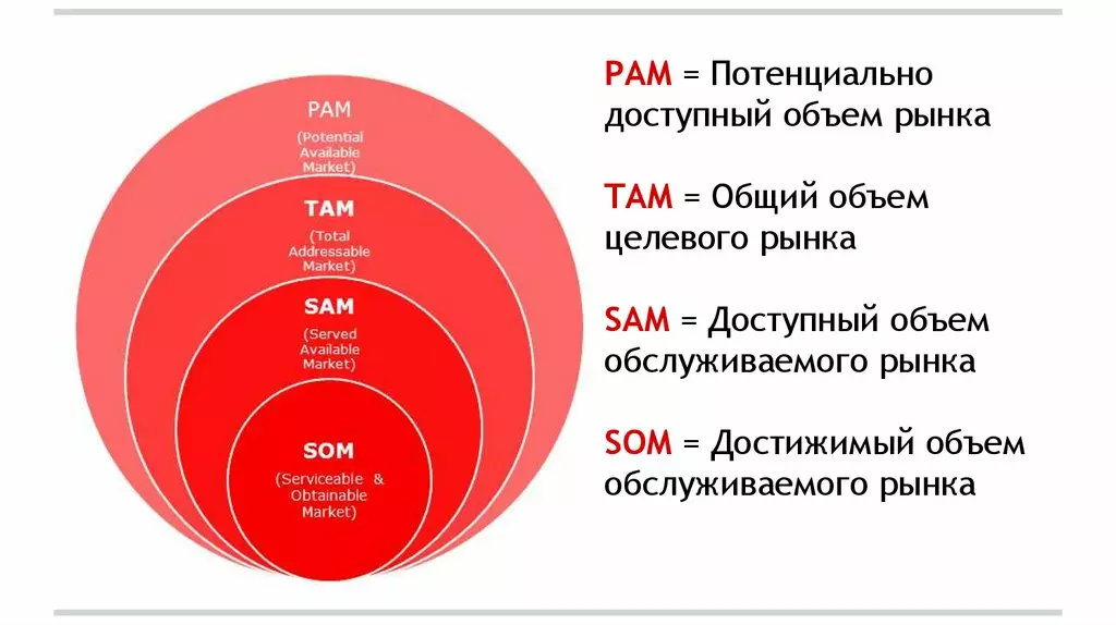 Методика PAM, TAM, SAM, SOM делит рынок на несколько уровней. Она рассматривает развитие компании как поэтапный процесс и показывает уровень спроса на каждом этапе.