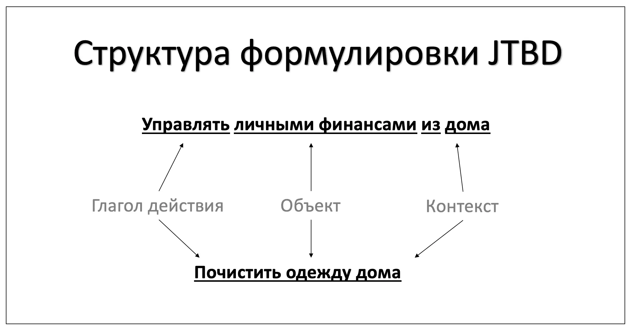 Теория JTBD — эффективный набор средств для повышения уровня рентабельности отдельной компании, помогающий развивать товар или привлекать новых потребителей. Суть его действия проста: удовлетворить спрос. Работы пользователей могут быть самыми разными и касаться всех сферах деятельности. В своей книге Энтони Ульвик, автор схемы, определяет JTBD так: действие, задача или цель, которую человек пытается выполнить.