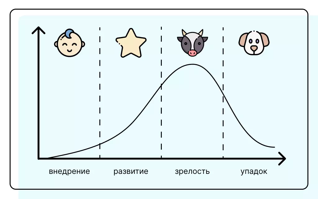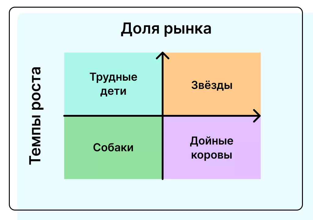Матрица БКГ используется в маркетинге для поиска перспективных сфер развития, представляет таблицу, которая включает четыре раздела: “дойные коровы”, “звезды”, “собаки”, “проблемные дети”. Сегменты matrix сопоставимы с этапами жизненного цикла продукта. Каждый товар находится в движении по секторам: превращается либо в “дойную корову”, либо “собаку”.
