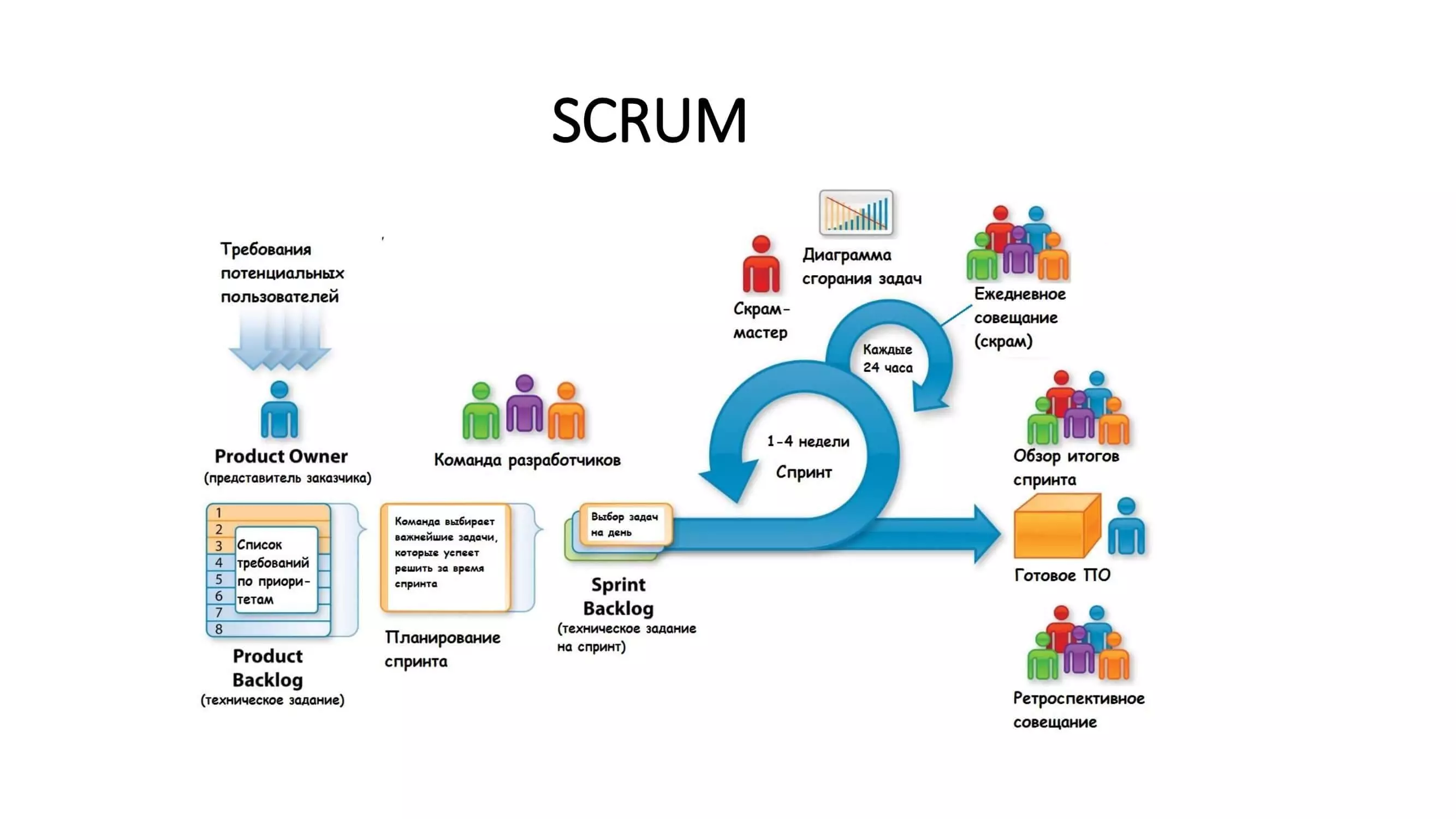 Основана на двухнедельных – тридцатидневных спринтах. Акцент – на команде. Во время спринта участники в течение 15 минут общаются для пересмотра результатов.