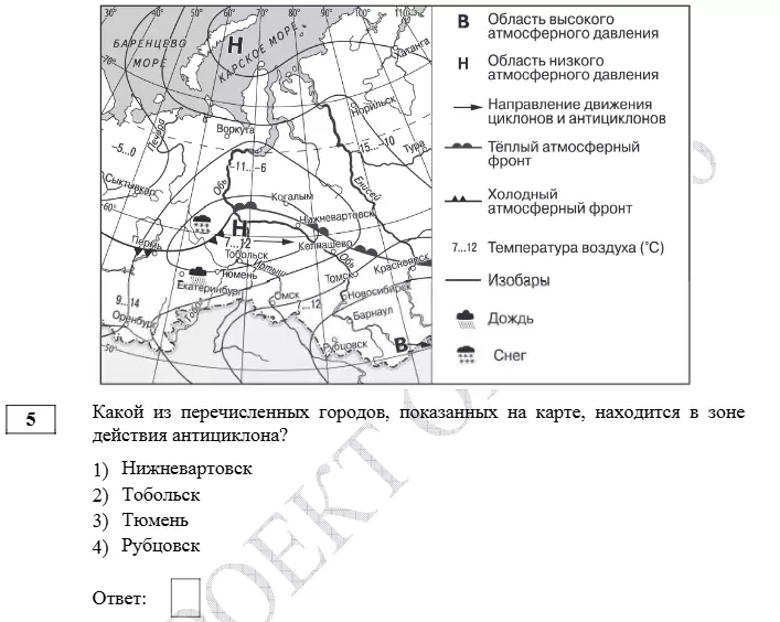 Задания 5 и 6. Для их выполнения требуется проанализировать представленную метеорологическую карту. Важно помнить: циклон на карте отмечен символом «Н», а антициклон — «В».