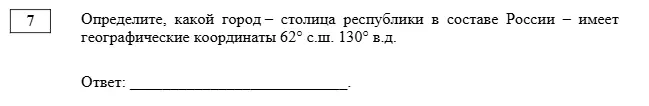 Задание 7. Задача — определить местоположение города, опираясь на заданные координаты. Необходимо знать, что представляет собой широта и чем она отличается от долготы. Именно эти термины нередко вызывают затруднения у учащихся на экзамене.