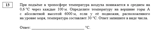 Задание 13. Требуется рассчитать, какой будет температура на вершине горы. Задание часто становится проблемой для выпускников. Причина — в необходимости проводить арифметические вычисления. В ходе подготовки нужно освоить методику составления пропорций и правила округления чисел.
