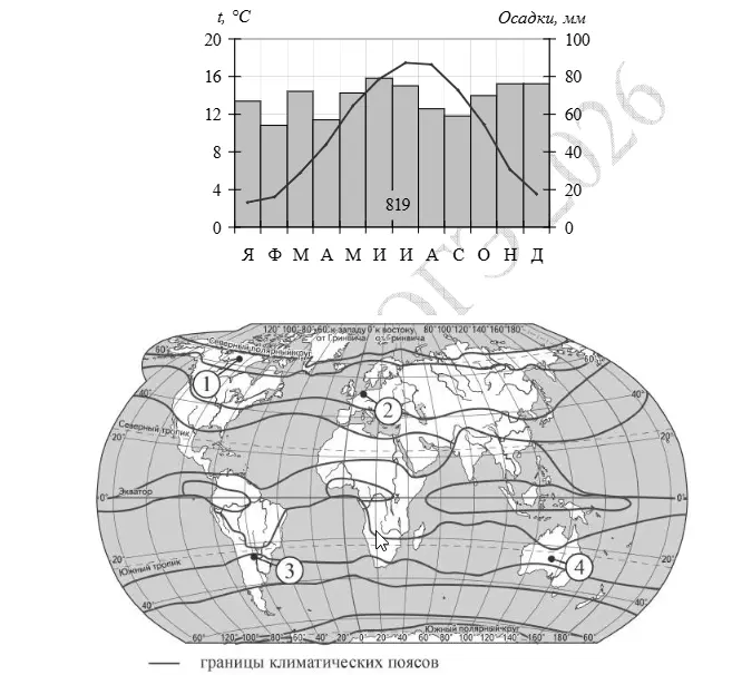 Задание 18. В этом задании потребуется применить навыки географического анализа. Сдающему предлагаются четыре точки, обычно — по две в северной и южной частях карты. Задача состоит в том, чтобы сопоставить климатограмму с конкретным населённым пунктом.