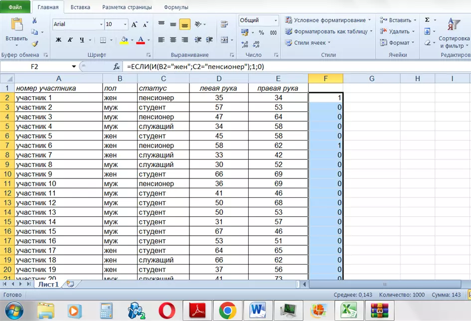 Затем эту формулу скопируйте во все ячейки от F3 до F1001. Теперь в каждой ячейке столбца F будут стоять цифры: 1 – если участник соответствует двум критериям отбора, 0 – если не соответствует.