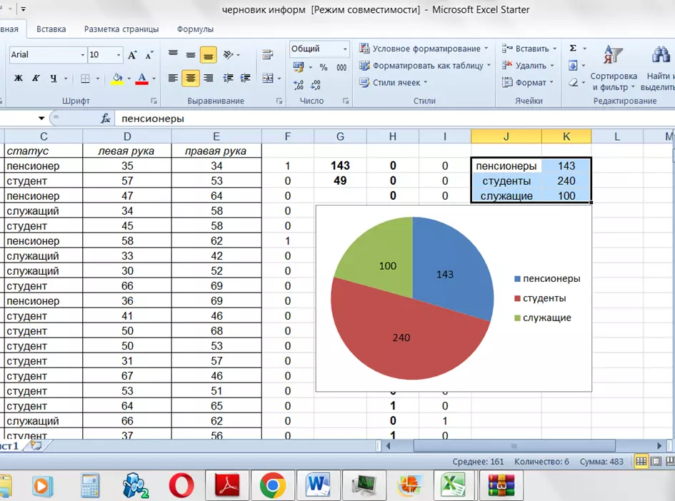 Создайте маленькую таблицу, в которой записаны данные о количестве пенсионеров, студентов и служащих. Потом зайдите в меню «Вставка», далее – «Круговая диаграмма». Щелкните на появившемся поле правой кнопкой мыши и нажмите «Выбрать данные». В поле «Диапазон данных для диаграммы» щелкните на значок со стрелкой и выберите мышкой все ячейки маленькой таблицы, нажмите «Enter». Диаграмма готова. Теперь нужно сделать подписи – количество человек в каждой группе. Зайдите в меню «Макет», далее – «Подписи данных», «По центру».