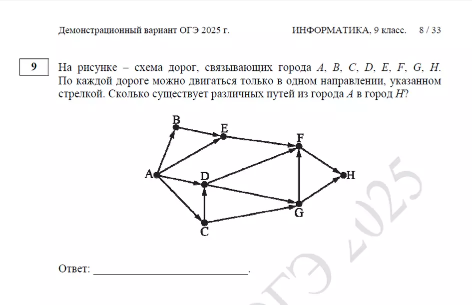 Количество путей до города H равно количеству путей, которыми можно добраться в любой из тех городов, из которых есть дорога в H. Используя это наблюдение, считаем последовательно количество путей до каждого города: