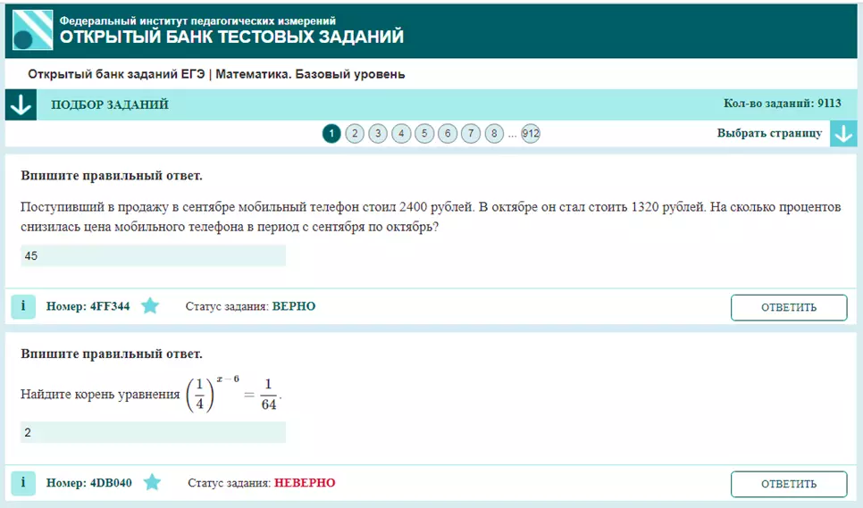 Также на сайте ФИПИ вы можете сразу проверить себя, решая примеры онлайн из открытого банка заданий. Возьмите черновик, напишите условие задачи, найдите нужную формулу, решите пример. Затем запишите ответ в ячейку на сайте и нажмите кнопку «ОТВЕТИТЬ». Система сразу покажет, как решено задание: ВЕРНО (зеленым цветом) или НЕВЕРНО (красным цветом).