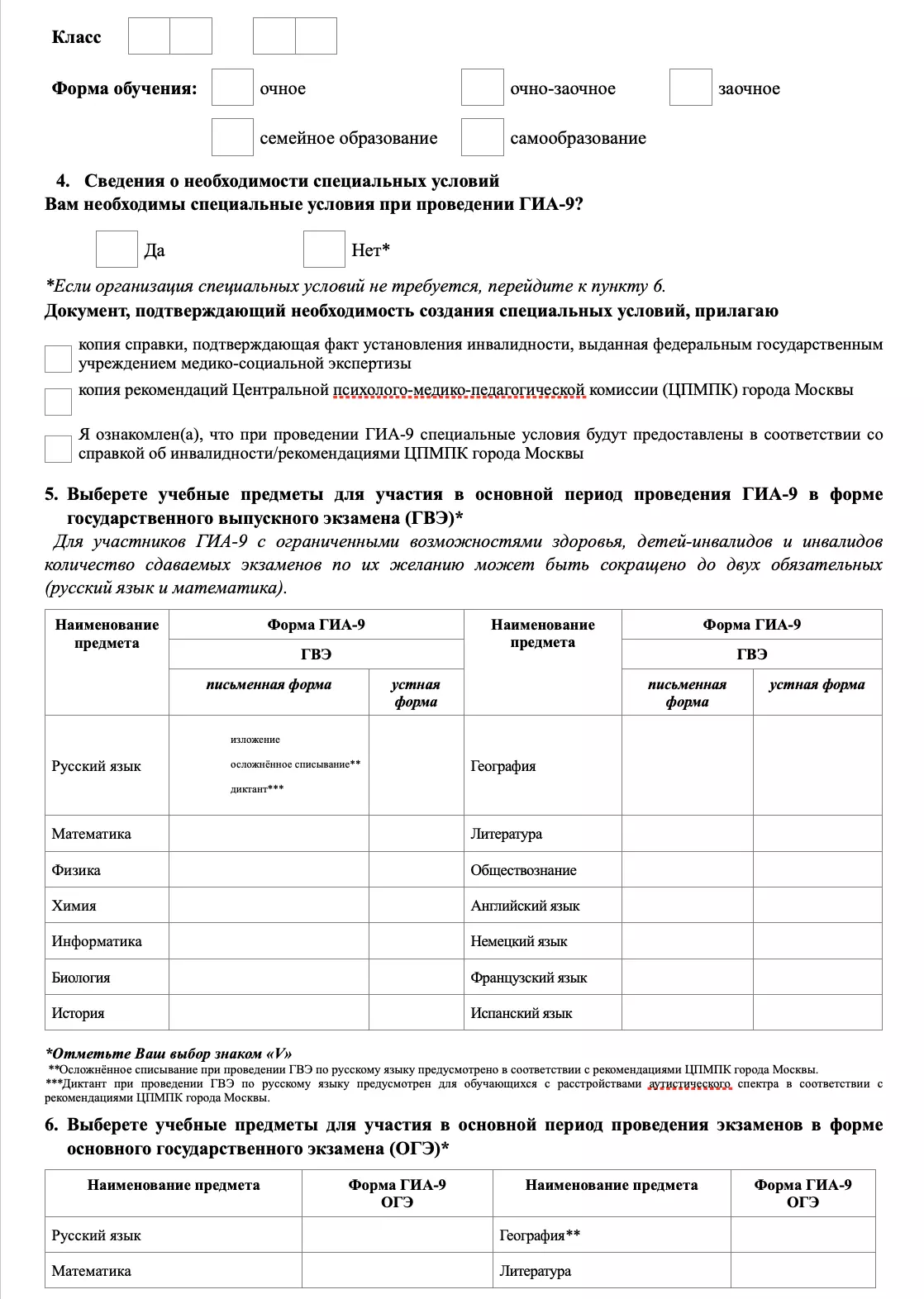 Образец бумажного заявления о регистрации на ОГЭ