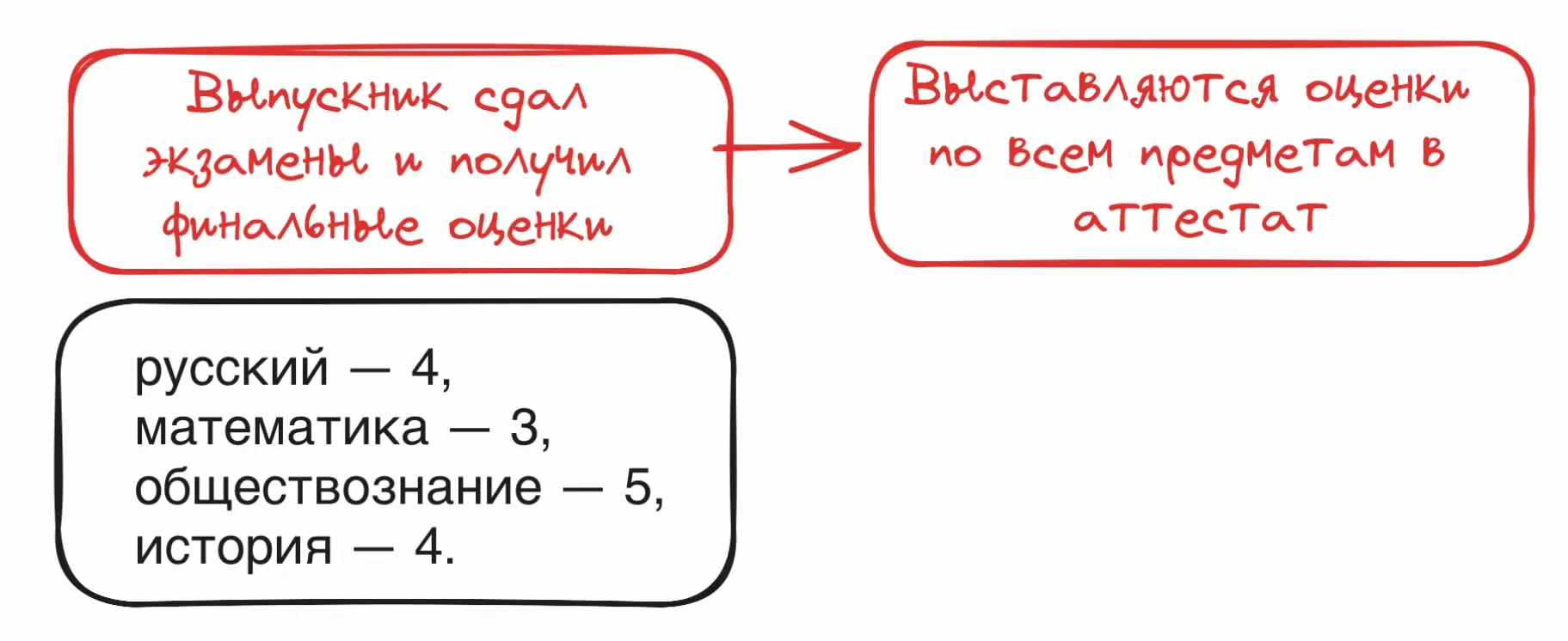 Теперь представим такую же ситуацию в 11-м классе. Если сдать ЕГЭ по русскому на минимальный балл, то в аттестате всё равно будет оценка, которую ученик заработал при учёбе в старшей школе. Например, если по русскому получить «4», а экзамен сдать на 100 баллов, то в аттестате всё равно будет четвёрка.