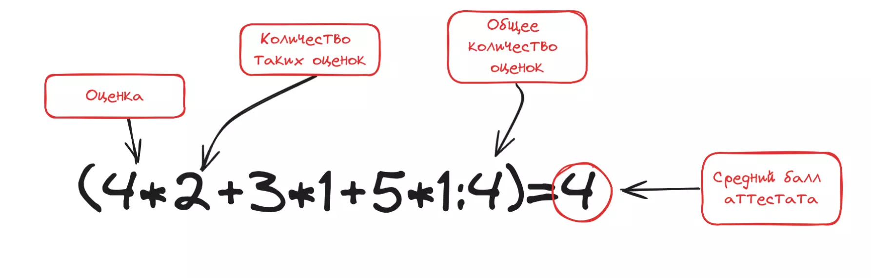 Теперь можно считать среднее арифметическое аттестата. Для этого складываются все оценки и делятся на их общее количество. Например, если представить, что в аттестате только 4 предмета (на практике их, конечно, больше), то получилось бы так: