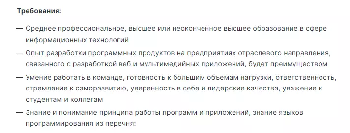 Требования к вакансии преподавателя веб- и мобильной разработки от Правительства Москвы на сайте hh.ru