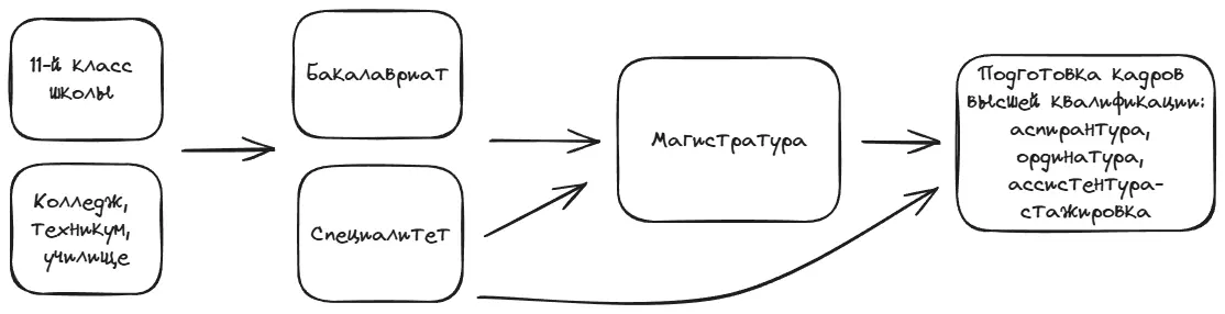 - Подготовка кадров высшей квалификации — аспирантура, ординатура, ассистентура-стажировка. На этот уровень не попасть после бакалавриата, но зато он доступен специалистам и магистрам. Здесь учатся будущие учёные, преподаватели, исследователи, специалисты узкой квалификации в конкретной области. Выпускники получают высшую квалификацию — аспирант, ординатор или ассистент-стажёр.